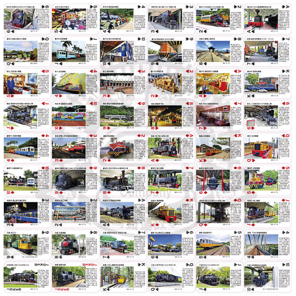 全台火車景點巡禮❤ 54張撲克牌每張圖樣都不同唷 ❤ 每盒均附贈一張鐵道旅行景點地圖! 【 商品規格 】 商品名稱:台灣火車系列撲克牌-火車處處開 商品材質:紙 商品尺寸:約8.8 x 5.8 cm 包裝材質:精緻透明壓克力盒 Made in Taiwan 台灣鐵道故事館有限公司出品 【 注意事項 】 照片均為商品實體拍攝,因拍攝環境差異與螢幕色差僅供參考,真實色彩以商品實體為準