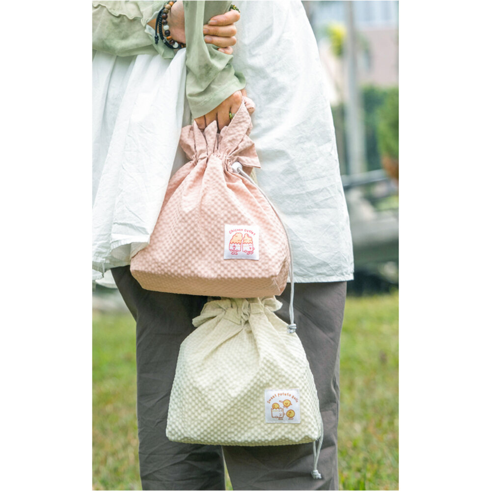 特殊泡泡格紋布精心縫製,質感獨特耐用,搭配束口設計,安心又可愛。