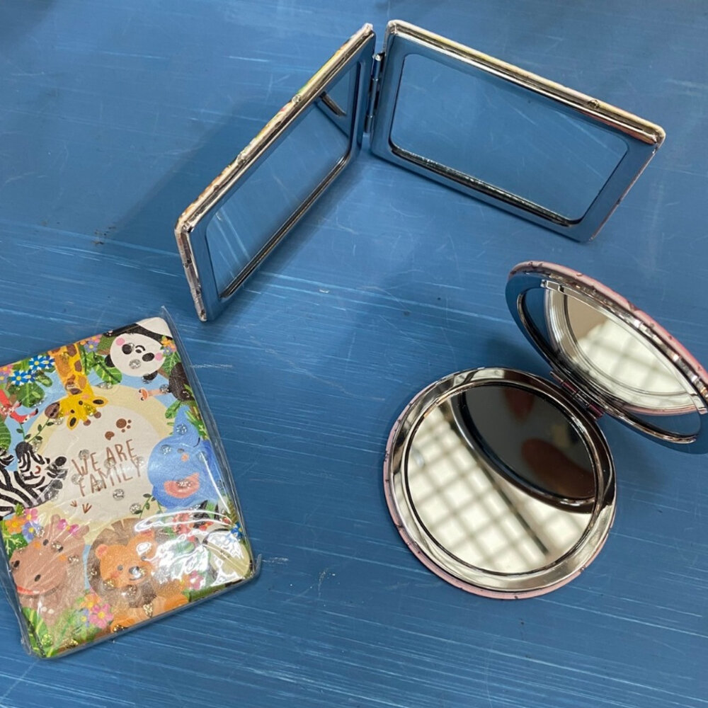 一面正常一面放大 材質:金屬、合成皮、亮粉 尺寸: 圓形 約 7.2cm × 7.2cm 長形 約 6.2cm × 8.7cm 淨重:52g 產地:台灣