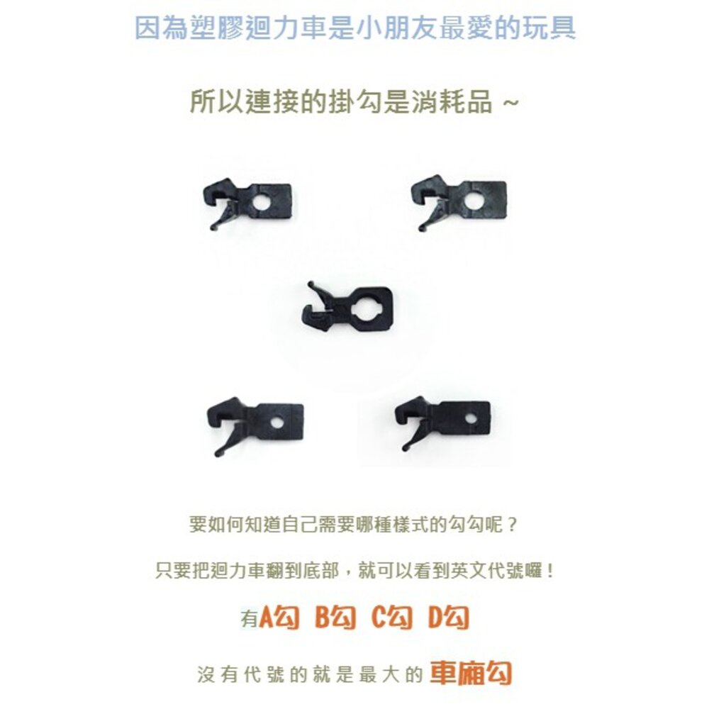 因為迴力車小朋友超愛玩的!! 所以連接的掛勾屬於消耗品,平均一個月被玩斷好幾個勾勾是家常便飯!囧 要如何知道自己需要替換的是哪種款式的勾勾呢? 只要把迴力車翻到底部,就可以看到英文代號囉 ! 車頭及少數車廂有分【A勾】、【B勾】、【C勾】、【D勾】 車廂沒有代號的話就是適用洞最大的【車廂勾】