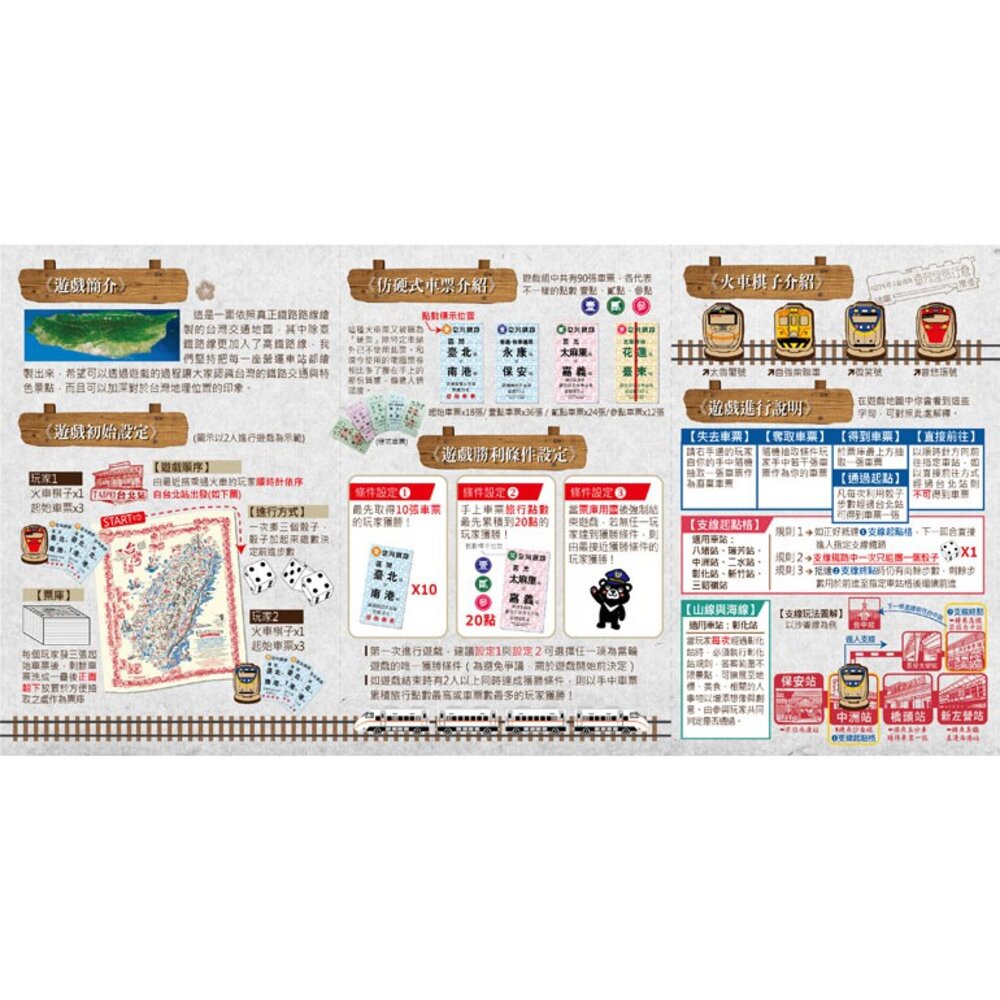 「布見不散。」帆布地圖-台灣鐵路環島旅行x1、火車棋子x4、骰子x3、硬式車票x90、說明書x1